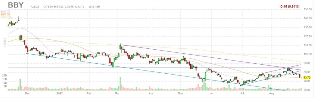 Согласно обнародованному отчету, прибыль компании Best Buy (BBY) по итогам второго квартала 2023 финансового года (ФГ) достигла $1.54 в расчете на одну акцию (против $2.98 на одну акцию во втором квартале 2022 ФГ), что оказалось выше среднего прогноза аналитиков на уровне $1.29 на одну акцию.