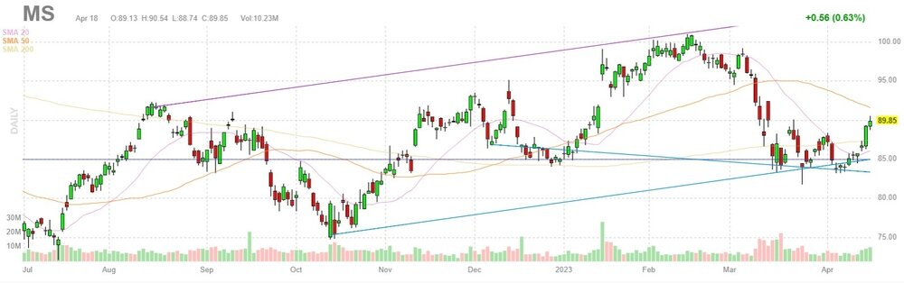 Согласно обнародованному отчету, прибыль компании Morgan Stanley (MS) по итогам первого квартала 2023 финансового года (ФГ) достигла $1.70 в расчете на одну акцию (против $2.02 на одну акцию в первом квартале 2022 ФГ), что оказалось выше среднего прогноза аналитиков на уровне $1.66 на одну акцию.