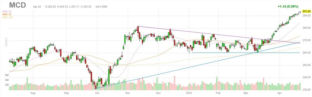 Согласно обнародованному отчету, прибыль компании McDonald's (MCD) по итогам первого квартала 2023 финансового года (ФГ) достигла $2.63 в расчете на одну акцию (против $2.28 на одну акцию в первом квартале 2022 ФГ), что оказалось выше среднего прогноза аналитиков на уровне $2.34 на одну акцию.