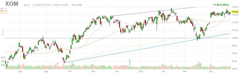 Согласно обнародованному отчету, прибыль компании Exxon Mobil (XOM) по итогам первого квартала 2023 финансового года (ФГ) достигла $2.83 в расчете на одну акцию (против $2.07 на одну акцию в первом квартале 2022 ФГ), что оказалось выше среднего прогноза аналитиков на уровне $2.60 на одну акцию.