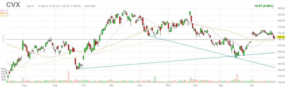 Согласно обнародованному отчету, прибыль компании Chevron (CVX) по итогам первого квартала 2023 финансового года (ФГ) достигла $3.55 в расчете на одну акцию (против $3.36 на одну акцию в первом квартале 2022 ФГ), что оказалось выше среднего прогноза аналитиков на уровне $3.41 на одну акцию.