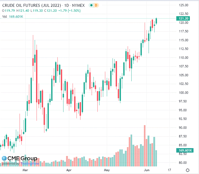 Стоимость июльского фьючерса на американскую легкую нефть марки WTI (Light Sweet Crude Oil) выросла до 121,20 доллара за баррель на Нью-йоркской товарно-сырьевой бирже.