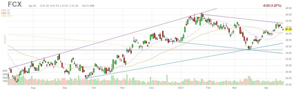 Согласно обнародованному отчету, прибыль компании Freeport-McMoRan (FCX) по итогам первого квартала 2023 финансового года (ФГ) достигла $0.52 в расчете на одну акцию (против $1.07 на одну акцию в первом квартале 2022 ФГ), что оказалось выше среднего прогноза аналитиков на уровне $0.45 на одну акцию.