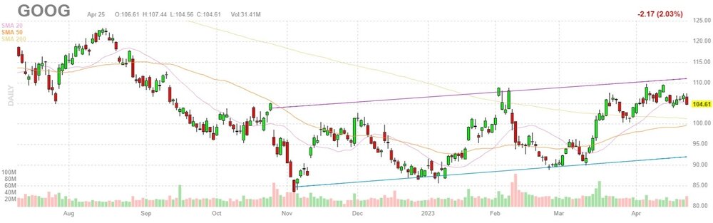 Согласно обнародованному отчету, прибыль компании Alphabet (GOOG) по итогам первого квартала 2023 финансового года (ФГ) достигла $1.17 в расчете на одну акцию (против $24.62 на одну акцию в первом квартале 2022 ФГ), что оказалось выше среднего прогноза аналитиков на уровне $1.07 на одну акцию.