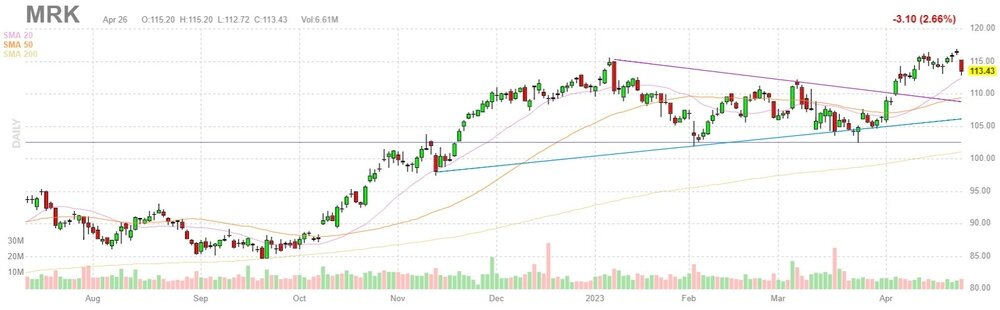 Согласно обнародованному отчету, прибыль компании Merck (MRK) по итогам первого квартала 2023 финансового года (ФГ) достигла $1.40 в расчете на одну акцию (против $2.14 на одну акцию в первом квартале 2022 ФГ), что оказалось выше среднего прогноза аналитиков на уровне $1.34 на одну акцию.
