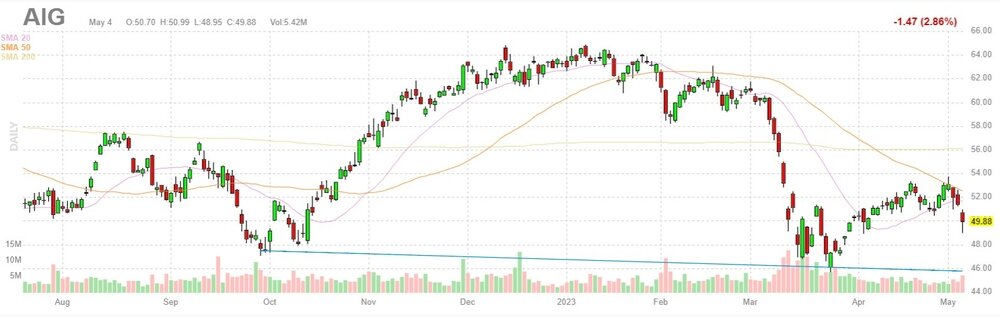 Согласно обнародованному отчету, прибыль компании American Intl (AIG) по итогам первого квартала 2023 финансового года (ФГ) достигла $1.63 в расчете на одну акцию (против $1.30 на одну акцию в первом квартале 2022 ФГ), что оказалось выше среднего прогноза аналитиков на уровне $1.42 на одну акцию.